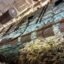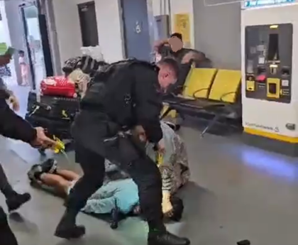 Three police officers—one male and two female—approach two men standing by a ticket machine and proceed to restrain one of them, who is dressed in a matching light blue top and shorts.