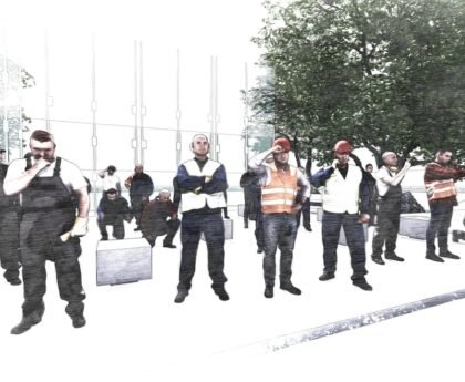 The second man, wearing a black t-shirt, then circles around the male officer leading the restraint of the first man and appears to begin an attack.