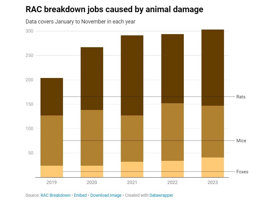 Breakdowns caused by rodents have risen by 55% from 196 incidents in the first 11 months of 2018 to a record 303 over the same period in 2023, according to the motoring organisation. The problem worsens significantly as the seasons change, averaging a 66% increase from summer to autumn over the last five years.